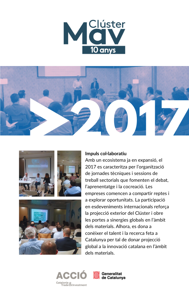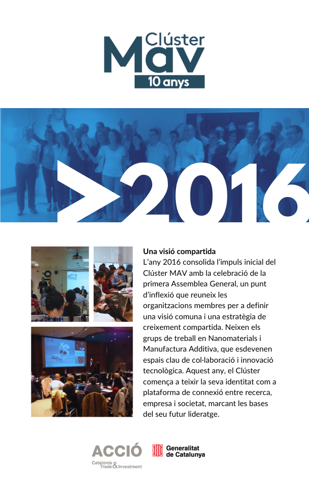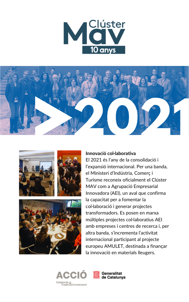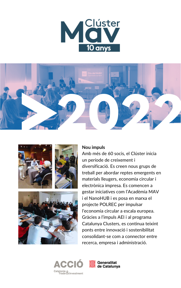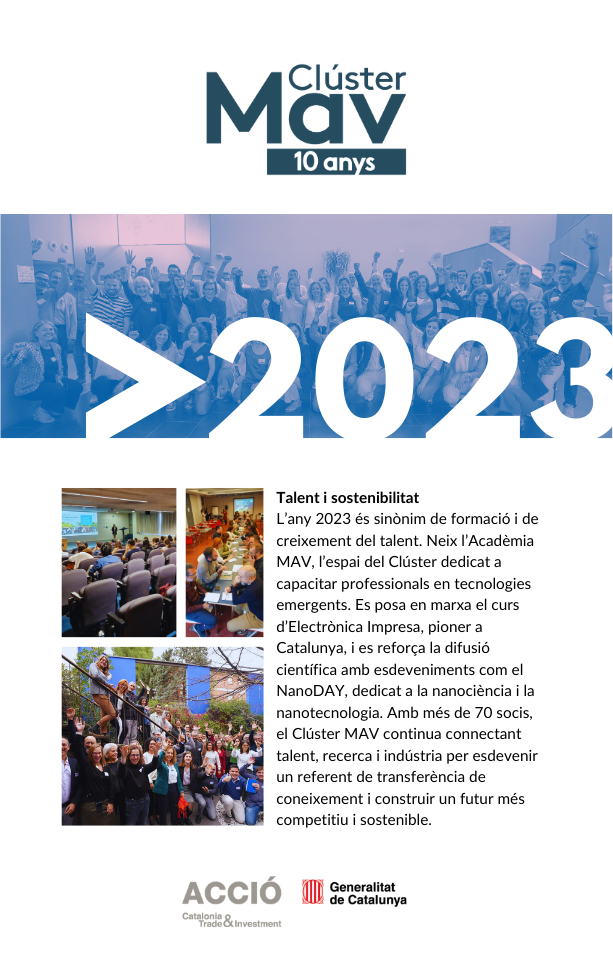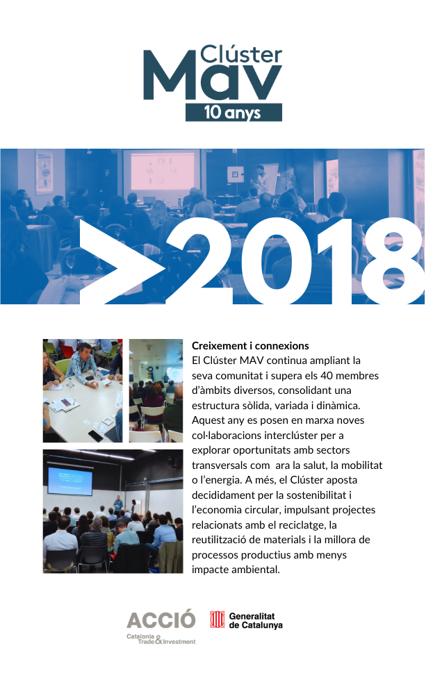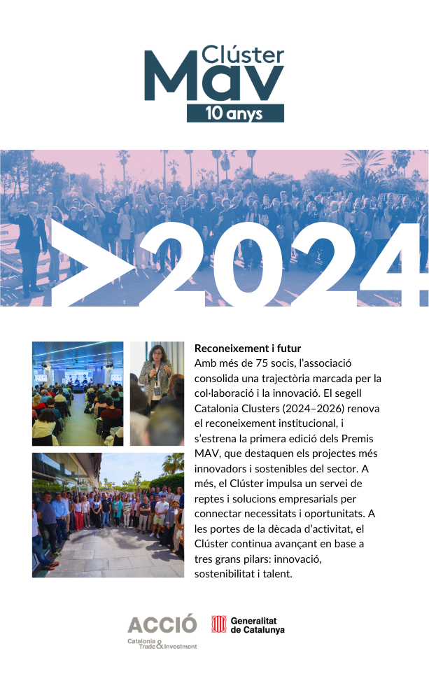 El 2025 culmina amb la celebració del 10è aniversari del Clúster MAV i amb el Dia del MAV com a gran punt de trobada del sector. Aquesta exposició retrospectiva simbolitza el tancament d’una dècada intensa i l’inici d’una nova etapa, amb la mirada posada en el futur, els nous reptes i les oportunitats que vindran.