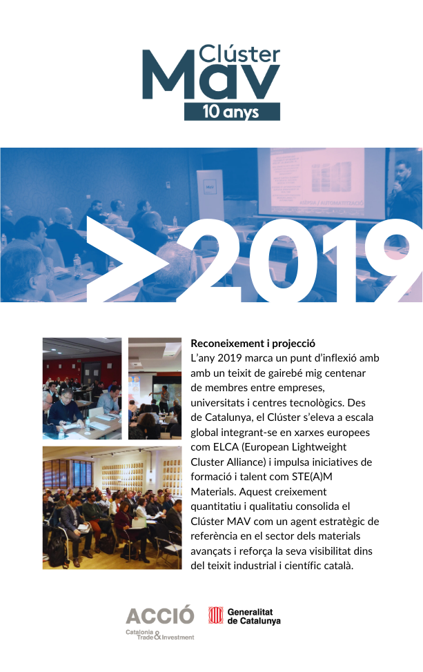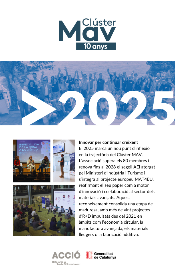 El 2025 ha estat un any molt especial per al Clúster dels Materials Avançats de Catalunya (Clúster MAV): la celebració dels seus 10 anys de trajectòria. Una dècada de creixement, aprenentatge i col·laboració que ha contribuït a posicionar els materials avançats com un element clau de la transformació industrial a Catalunya.