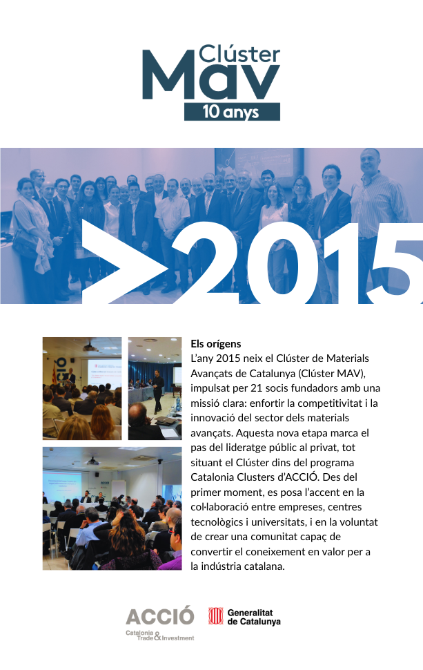 L’any 2015 neix el Clúster MAV amb una visió clara: crear un espai de trobada per connectar empreses, centres tecnològics, universitats i institucions vinculades als materials avançats. Amb 21 socis fundadors, el Clúster inicia la seva trajectòria amb l’objectiu de donar visibilitat al sector, fomentar la col·laboració i impulsar la innovació com a motor de competitivitat industrial.