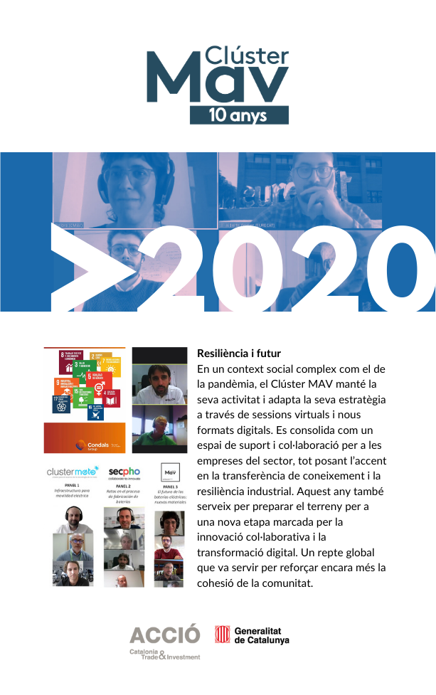 L’any 2020 suposa un repte inesperat. Davant un context global complex, el Clúster MAV demostra la seva capacitat d’adaptació, mantenint l’activitat, reforçant els vincles entre membres i explorant nous formats digitals per continuar generant valor. La resiliència del sector i del Clúster es posa clarament de manifest.