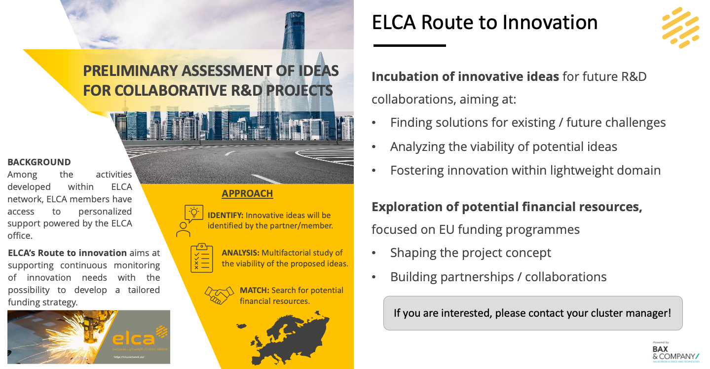ELCA (European Lightweight Cluster Alliance) és una iniciativa col·laborativa que té com a objectiu accelerar l'adopció de materials lleugers en indústries estratègiques. La mobilitat és l'objectiu principal de l'aliança, però també l'aplicació en altres sectors relacionats amb els materials lleugers, com ara l'energia, la salut, la defensa i la construcció. L'aliança crea un marc empresarial inclusiu únic per a explorar oportunitats de mercat impulsades pels materials lleugers. Els principals actors d'indústries i institucions de recerca establertes poden col·laborar-hi i facilitar activitats per a posar en pràctica les tecnologies lleugeres.