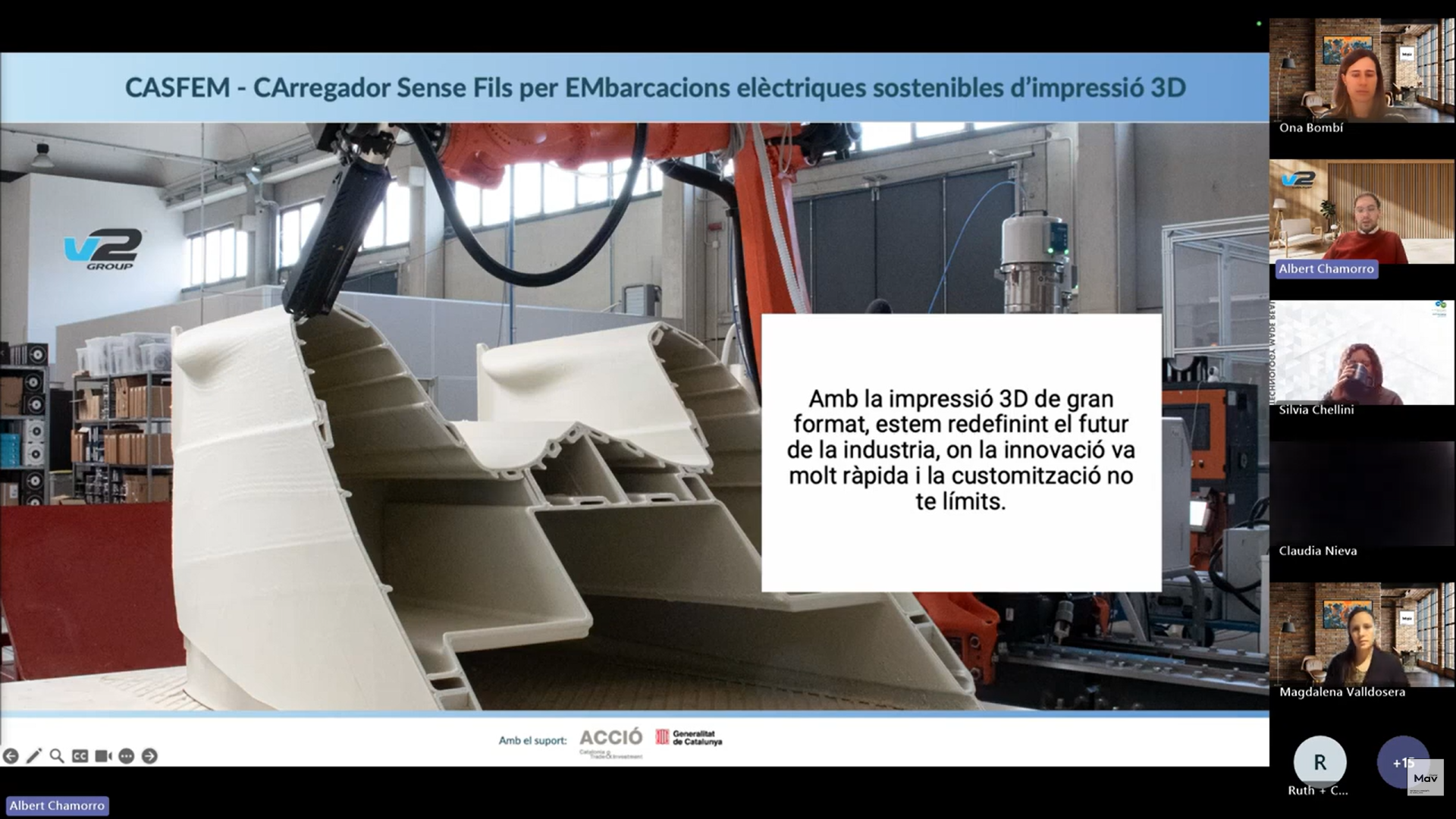 La presentació del projecte CASFEM va anar a càrrec d’Albert Chamorro, CEO de V2 Group, el qual va exposar els objectius, el repte tecnològic i el potencial industrial del projecte davant dels assistents al seminari en línia.
