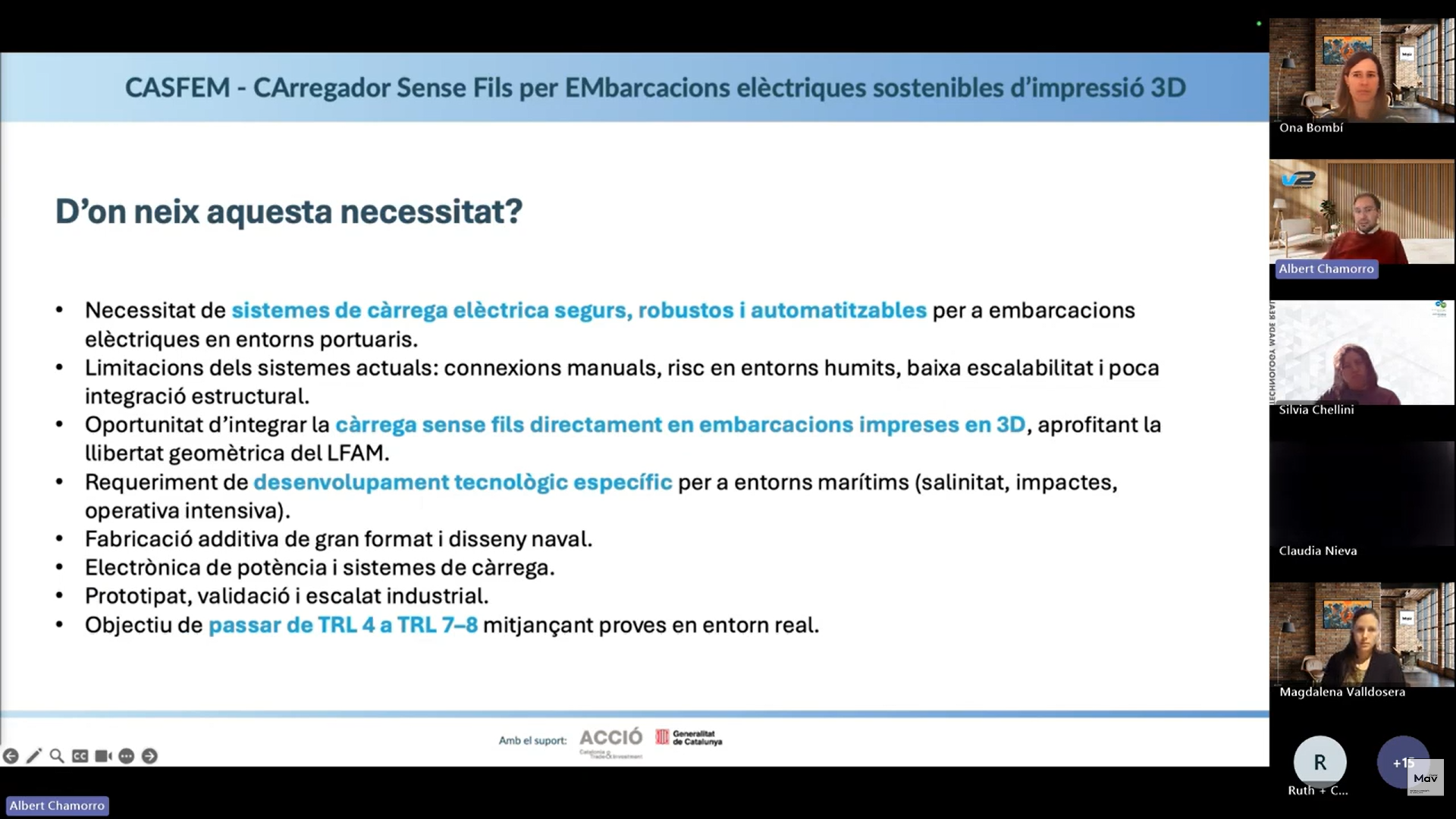 Durant la intervenció, Chamorro va explicar com CASFEM neix de la necessitat de disposar de sistemes de càrrega elèctrica més segurs, robustos i eficients per a embarcacions elèctriques que operen en entorns portuaris, superant les limitacions dels sistemes tradicionals basats en cables i connexions manuals, especialment crítiques en entorns humits i salins.