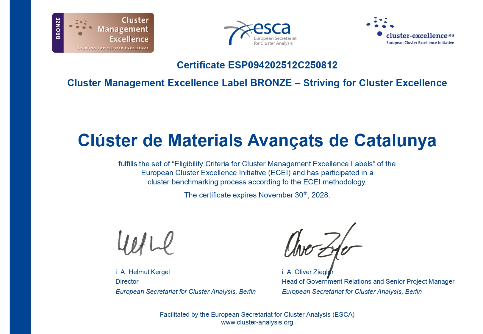El Clúster de Materials Avançats de Catalunya (Clúster MAV) ha estat reconegut amb el Cluster Management Excellence Label BRONZE – Striving for Cluster Excellence, una distinció europea atorgada per la European Secretariat for Cluster Analysis (ESCA) en el marc de la European Cluster Excellence Initiative (ECEI).