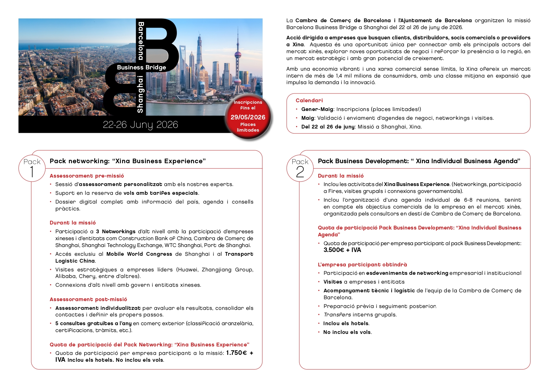 En aquest context, i en el marc del Barcelona Business Bridge, la Cambra de Comerç de Barcelona i l’Ajuntament de Barcelona organitzen una missió empresarial a Xangai. La iniciativa s’adreça a empreses que vulguin iniciar o reforçar la seva presència a la Xina, amb l’objectiu de trobar nous clients, distribuïdors, socis comercials o proveïdors en sectors estratègics.