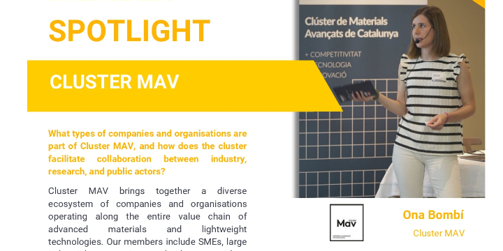 El Clúster MAV reuneix un ecosistema divers d’empreses i organitzacions que operen al llarg de tota la cadena de valor dels materials avançats i les tecnologies lleugeres. Els nostres membres inclouen pimes, grans empreses industrials, proveïdors de tecnologia, centres de recerca i tecnologia (RTO), universitats i entitats públiques, amb un fort enfocament en mobilitat, aeroespacial i manufactura avançada.
