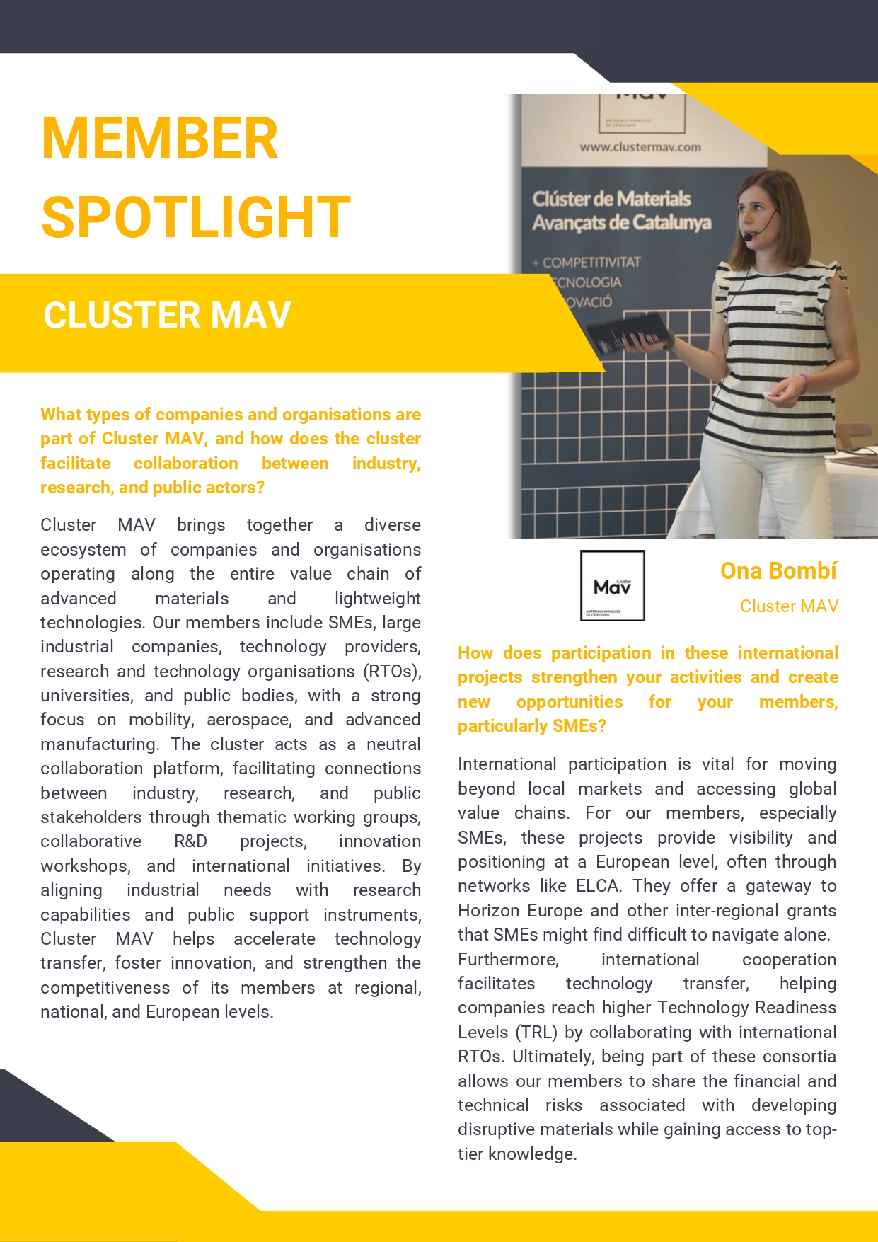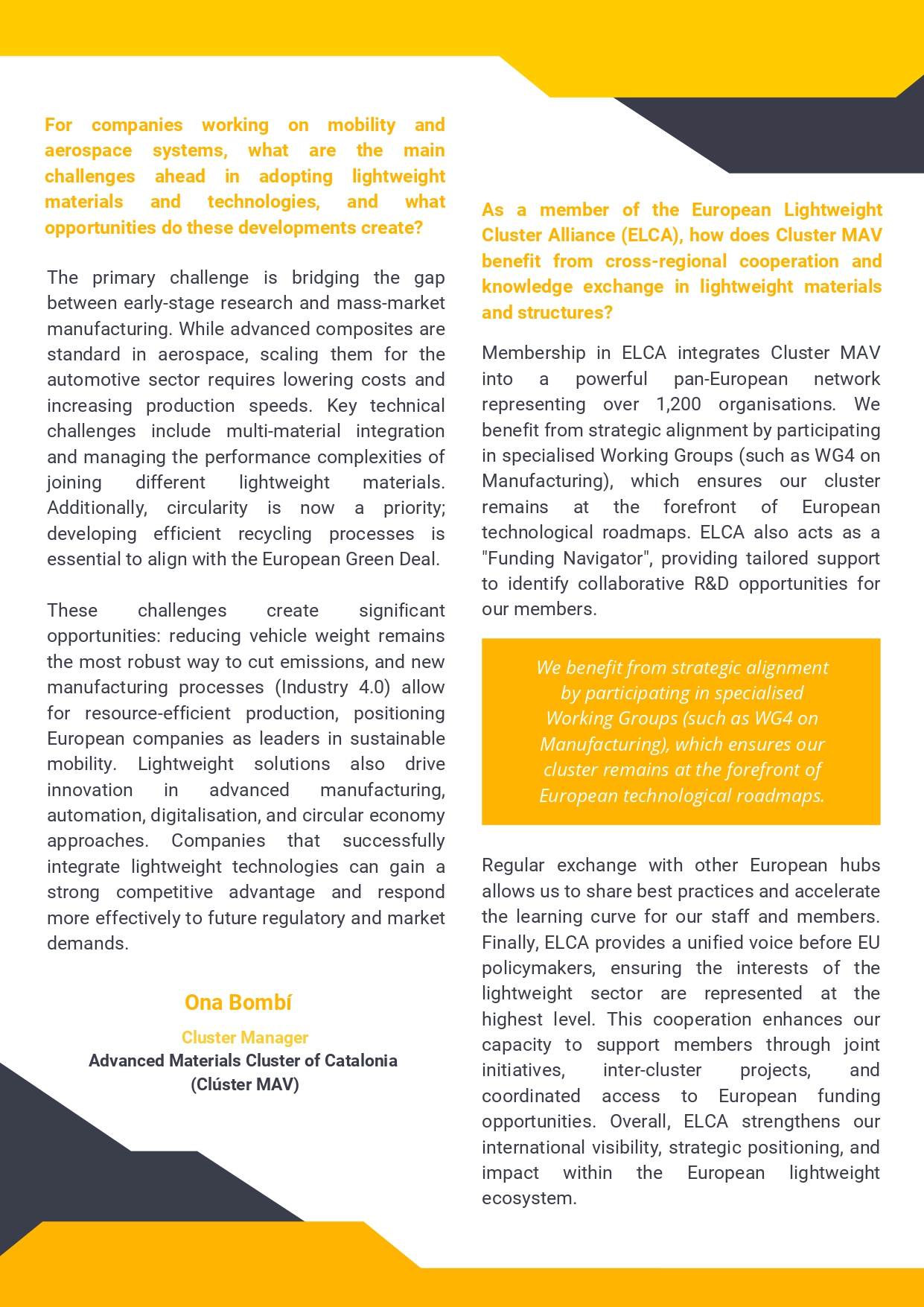 Com a membre de la European Lightweight Cluster Alliance (ELCA), com es beneficia el Clúster MAV de la cooperació interregional i l’intercanvi de coneixement en materials i estructures lleugeres?