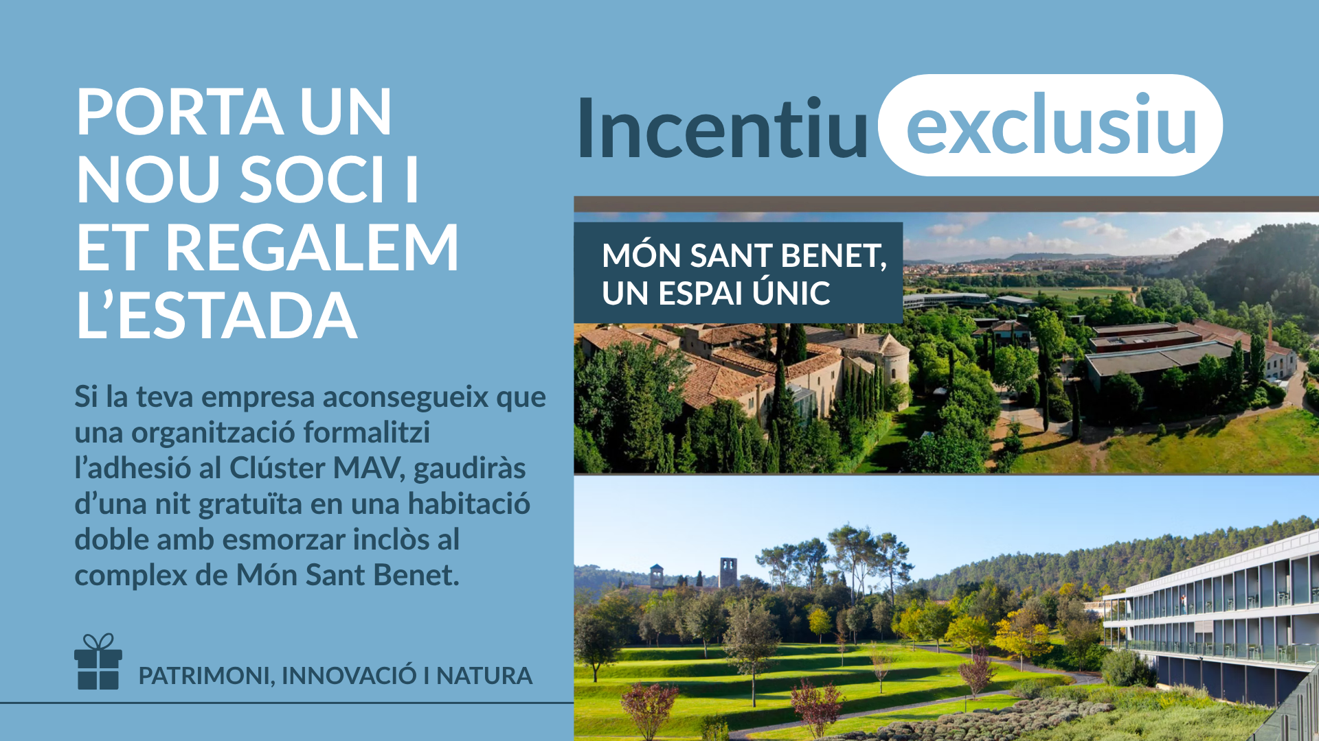 Com a incentiu addicional, les empreses que contribueixin a la incorporació d’un nou soci al Clúster MAV podran beneficiar-se d’una nit gratuïta al complex de Món Sant Benet. Les empreses que ho vulguin poden manifestar el seu interès a través d'aquest formulari.