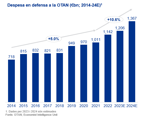 En els darrers anys, els països membres de l’OTAN han incrementat de manera significativa la seva despesa en defensa. Des de 2022, aquest augment s’ha intensificat arran del nou context geopolític a Europa, especialment després de la guerra d’Ucraïna, així com per la necessitat de reforçar les capacitats estratègiques i tecnològiques dels estats membres.