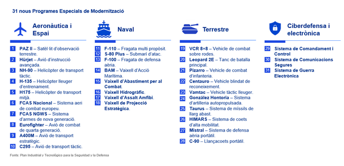 En aquest context, l'estat espanyol ha iniciat una acceleració de la inversió en defensa amb l’objectiu de convergir amb els compromisos adquirits en el marc de l’OTAN. Un dels principals instruments d’aquest impuls són els Programes Especials de Modernització (PEM), que inclouen nous programes en àmbits com l’aeroespai, el sector naval i terrestre, la ciberdefensa, els sistemes de comunicació segurs o els sistemes de comandament i control.